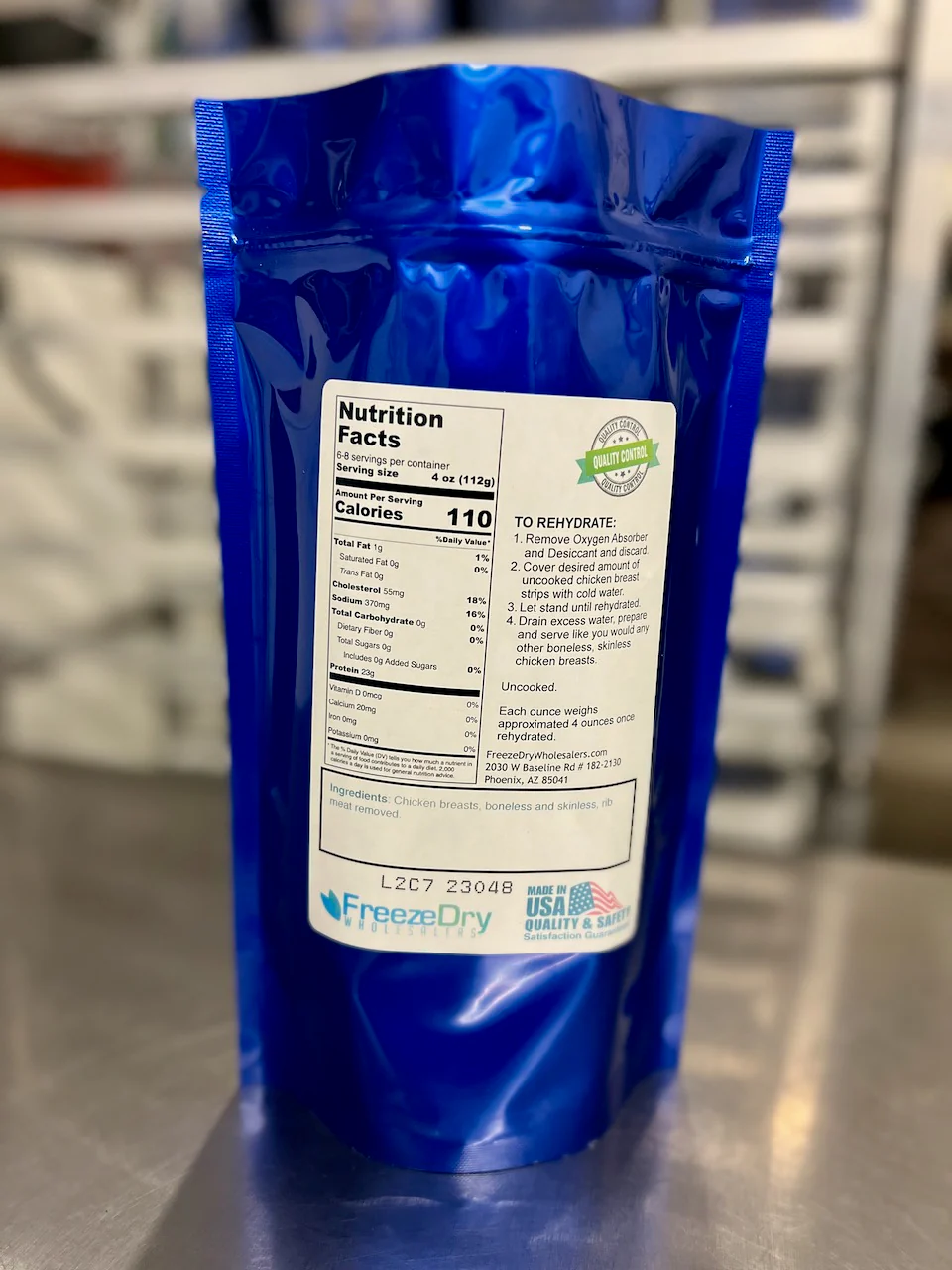 This bag contains 5 ounces of freeze dried uncooked boneless and skinless chicken breast strips, which is the equivalent of 20 ounces (1/1/4 pounds) of freshly cut and gourmet trimmed boneless and skinless chicken breast strips that are ready for your grill or your wok if purchased at your local high-end butcher shop once rehydrated and ready for use. Each ounce of these all natural uncooked top quality chicken breast strips will weigh approximately 4 ounces of freshly cut chicken breast strips when rehydrated.Â