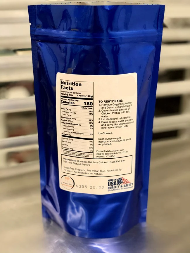With this product you will be purchasing one bulk package of freeze dried 1/3rd pound uncooked all-natural ground chicken patties with added duck fat for flavor that have a net weight of 10.0 ounces freeze dried, packaged for long term storage.