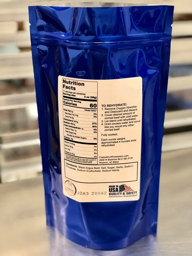 One (1) bulk package of freeze dried fully cooked Black Angus Corned Beef packaged for long term storage.