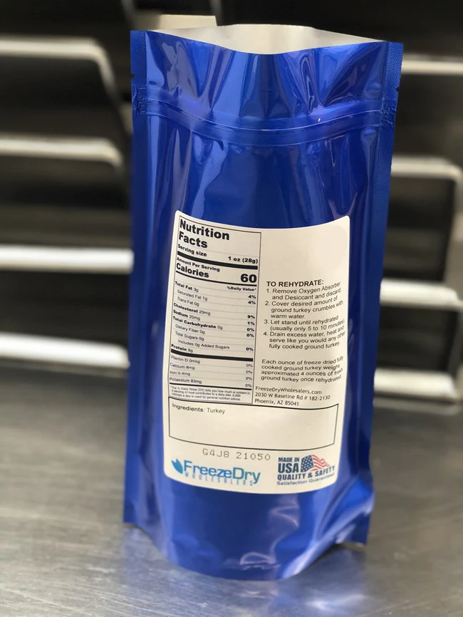 One (1) package of freeze dried freshly ground and fully cooked ground turkey packaged for long term storage.