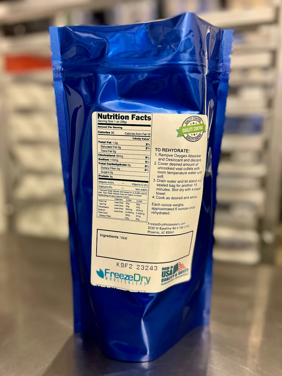 This bag contains 6-1/2 ounces of freeze dried veal cutlets, which is the equivalent of 26 ounces or 1.625 pounds of freshly trimmed and pounded veal cutlets that are ready for to prepare if purchased at your local gourmet butcher shop once rehydrated and ready for use. Each ounce of this incredibly tender veal will weigh approximately 4 ounces of freshly trimmed and pounded veal cutlets when rehydrated.
