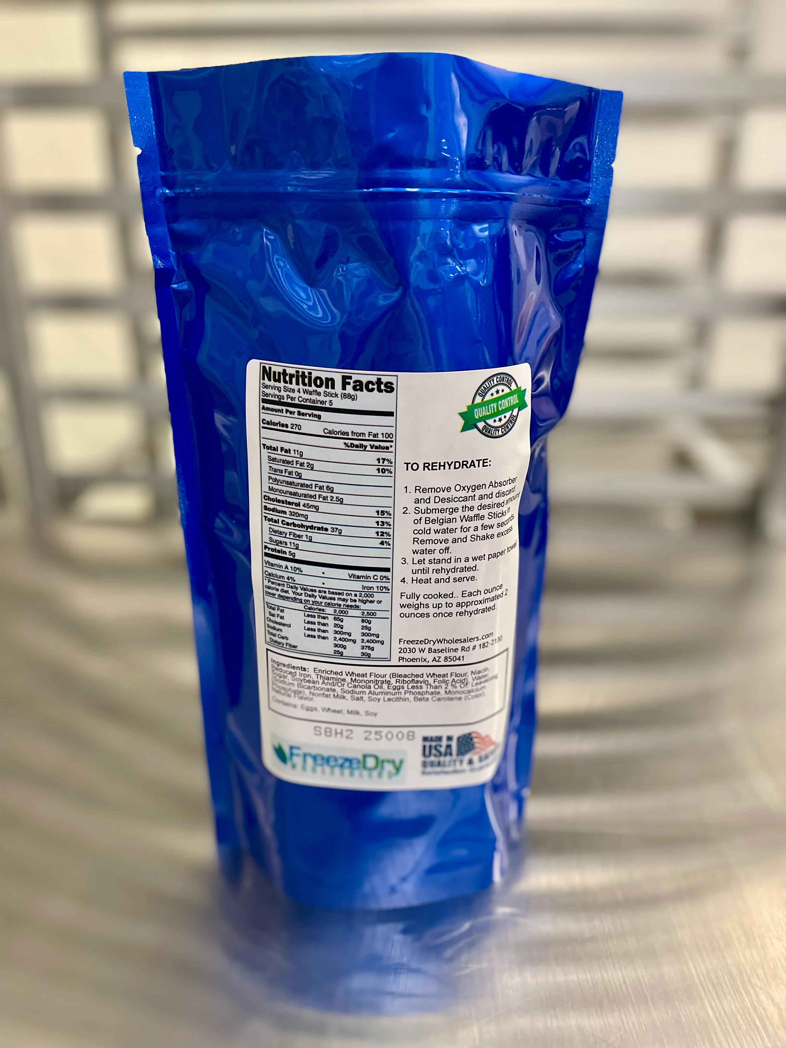 One (1) package of freeze dried fully cooked Belgian waffle sticks packaged for long term storage.