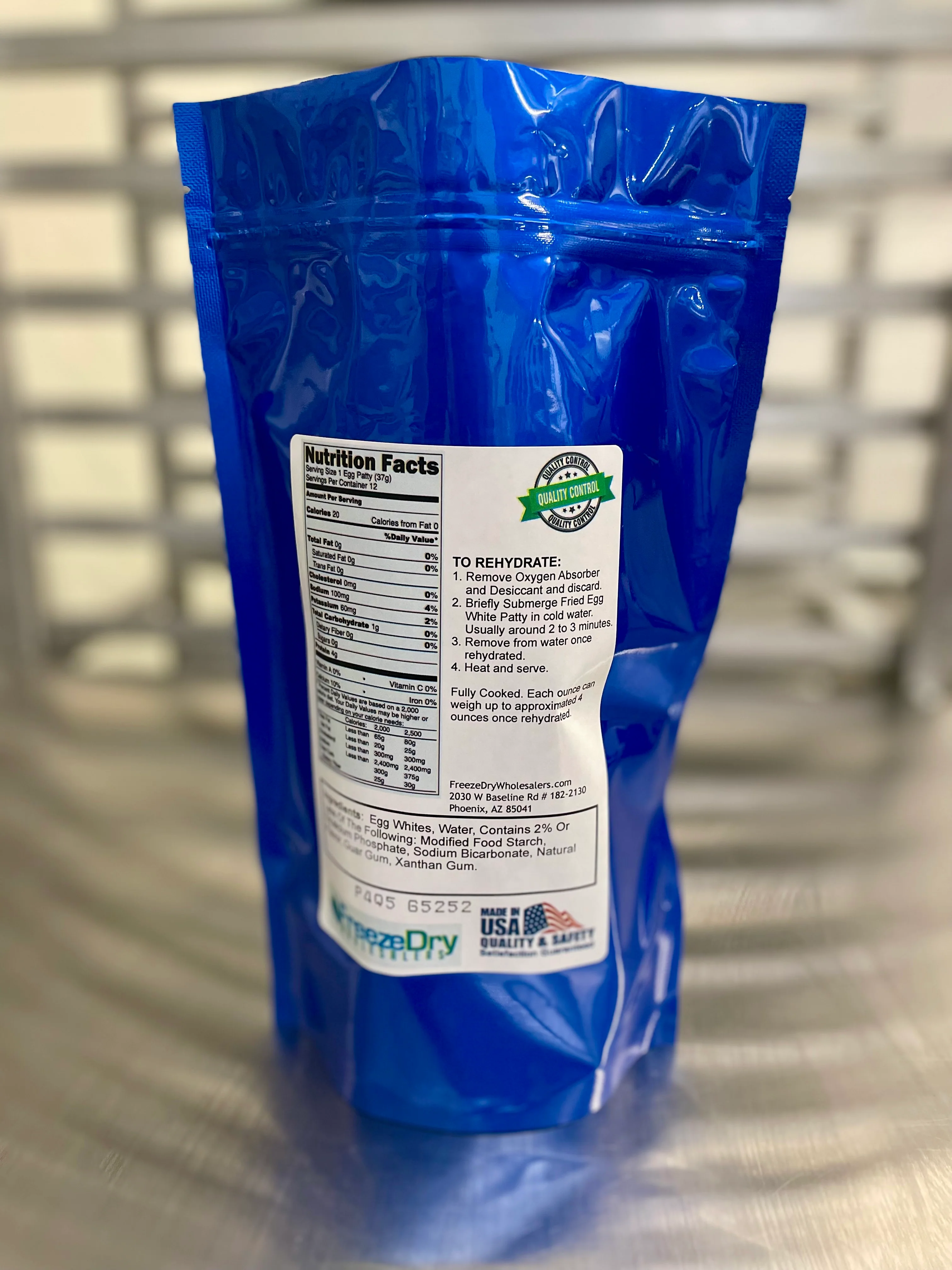 With this product you will be pre-purchasing one bulk package of freshly prepared freeze dried fried egg white patties with a net weight of 2.15 ounces, packaged for long term storage.