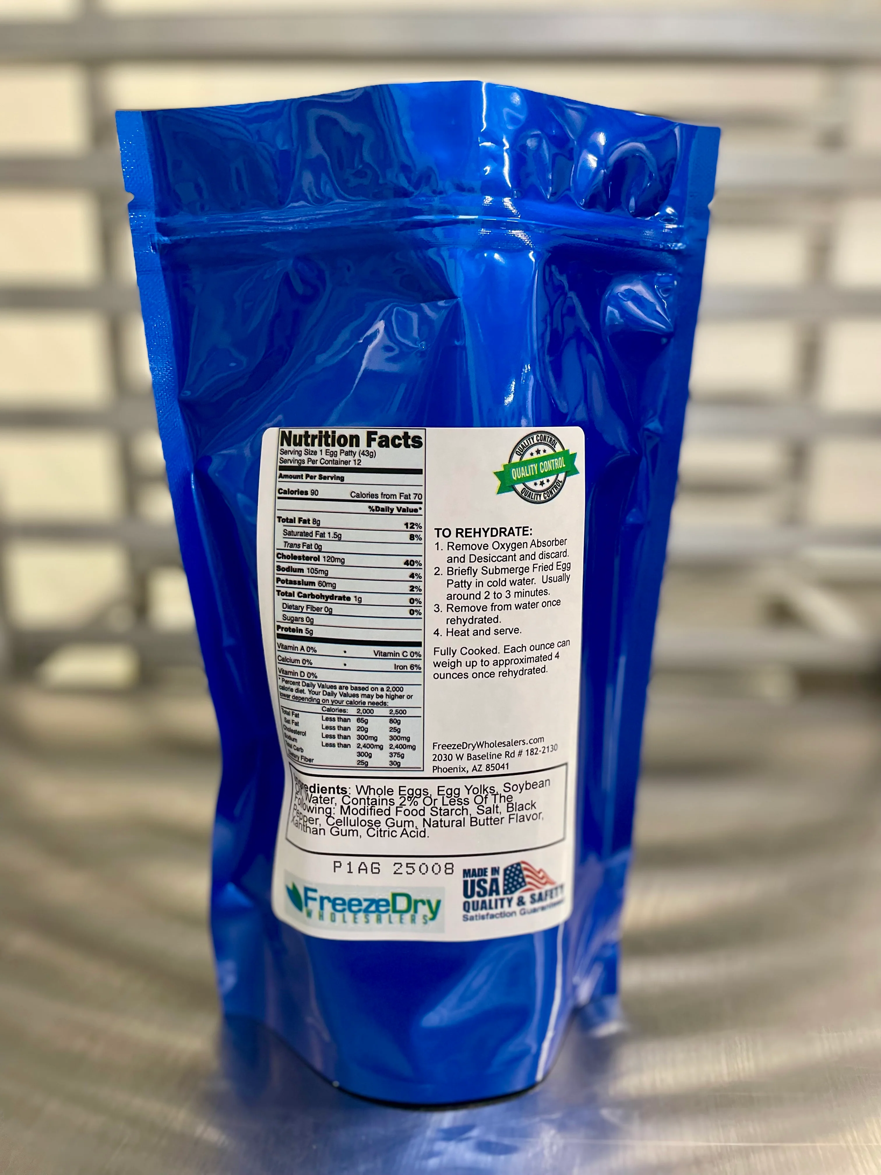 With this product you will be purchasing one bulk package of freshly prepared freeze dried fried whole eggs with a net weight of 5.85 ounces, packaged for long term storage.