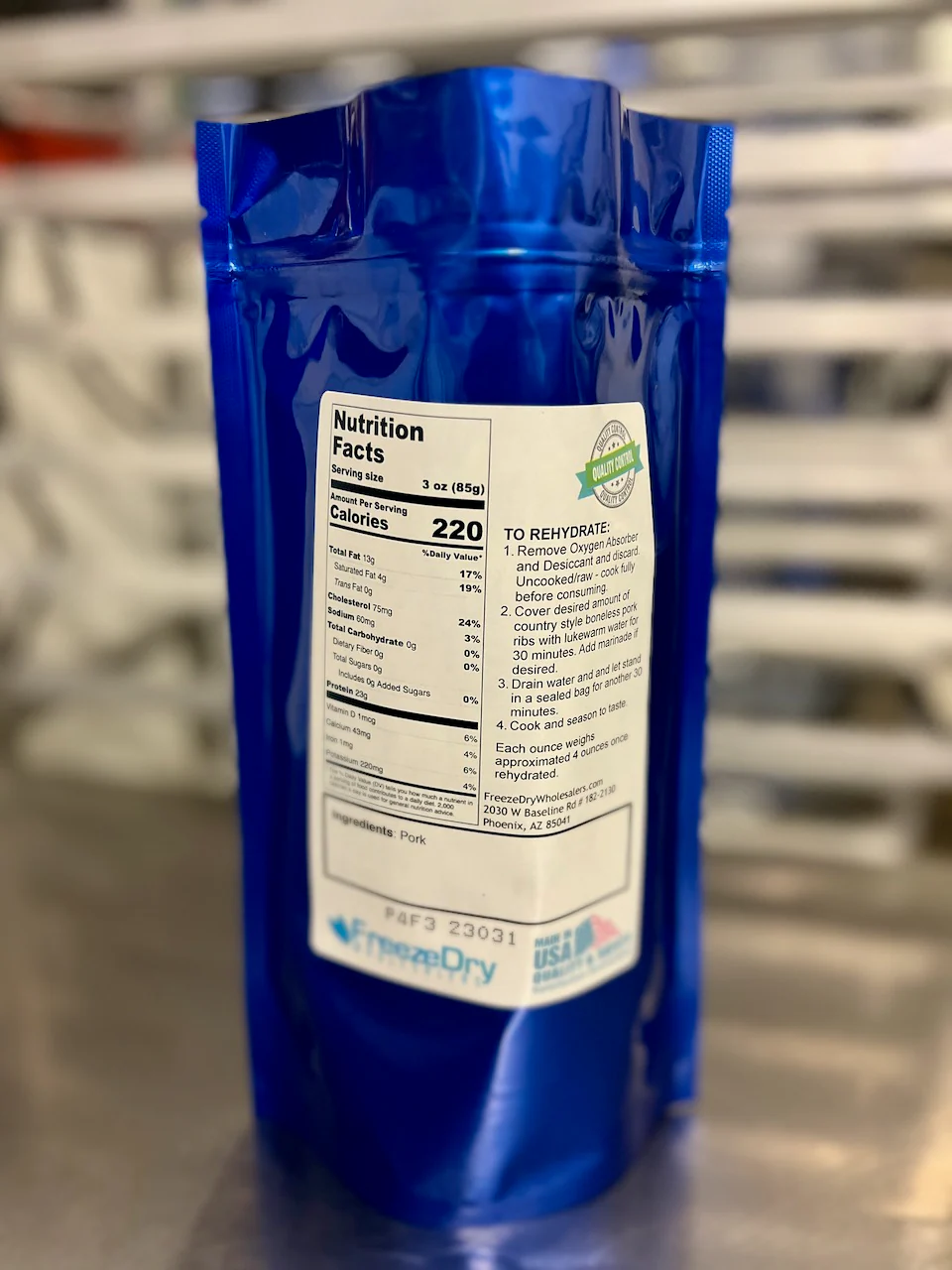 With this purchase you will be pre-ordering one bulk package of freshly freeze dried heritage breed (Duroc) high quality US uncooked country-style pork ribs with a net weight of 8.35 ounces, packaged for long term storage.